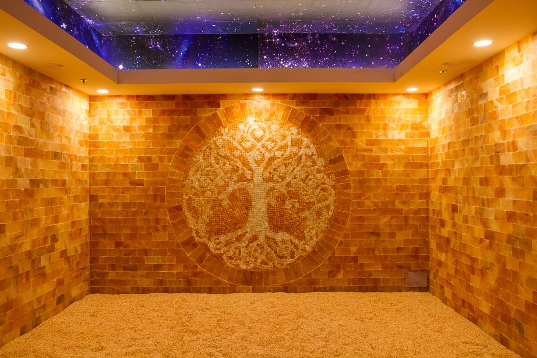 We imported 16 tons of beautiful salt from the Himalayas to create a slice of sacred space in our wellness center. While you're here for yoga, take time to experience the Himalayan salt cave. It's a 45 minute respiratory and breathing therapy that clears up and disinfects the respiratory system, boosts our immune system, and increases our health and wellness. It's hard to explain how calming, grounding, and rejuvenating being in the salt cave is. You just have to experience it.